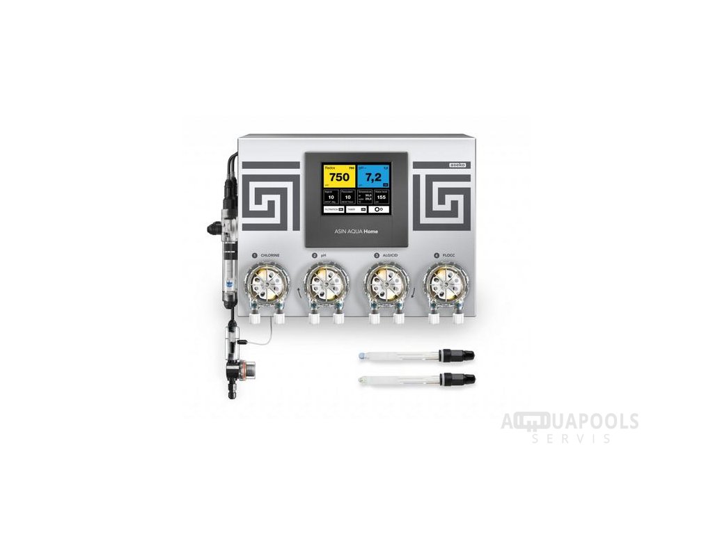Tvorí kompaktný celok skladajúci sa z riadiacej jednotky, elektródy na meranie pH, redox a štyroch dávkovacích čerpadiel s výkonom 60 ml/min. Stavové hodnoty chémie sa zobrazujú na vstavanom dotykovom displeji. Automatiky Asin Home sú štandardne vybavené aj pomocným relé na pripojenie bazénovej filtrácie s príkonom až 1kW a snímačom teploty na kontrolu a zobrazovanie teploty vody v bazéne.